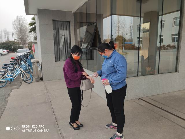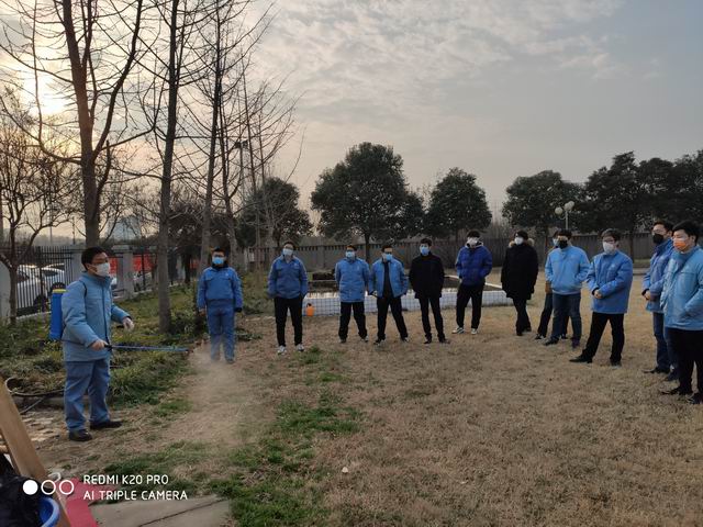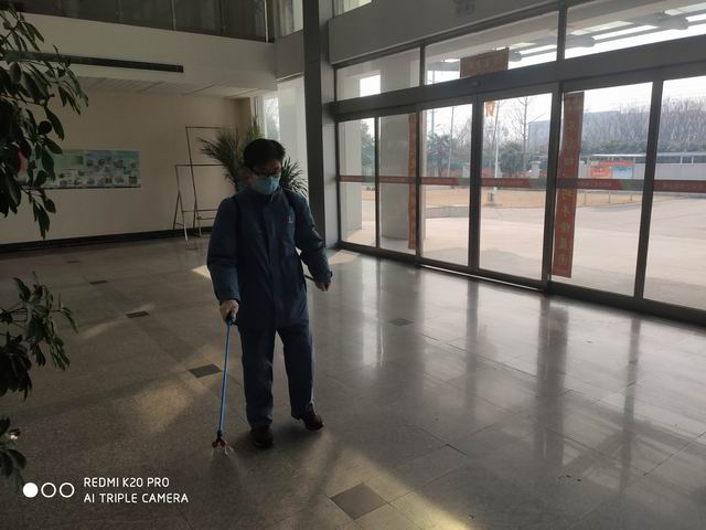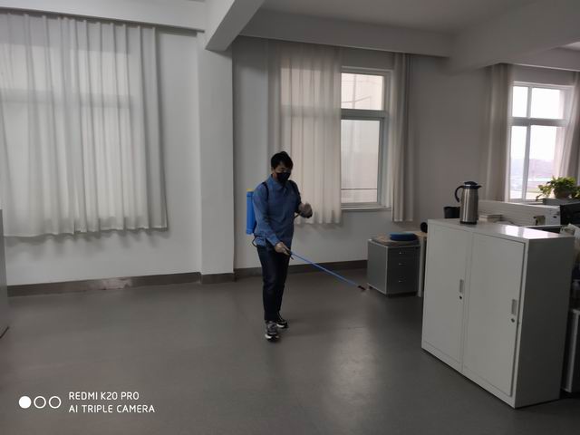 公司编制了详实的党团员突击队值班安排,组织大家做好公司工作区域的卫生消杀工作和人员管控工作等。权璀璀、杨刚刚两人有过务农喷洒农药的经验,他们亲自为大家示范,教大家如何调制84消毒液、如何使用农药喷雾器。男同志每天背着沉重的喷雾器,对办公楼内进行每天两次的84消毒液消杀,一天下来累得一身汗。女同志则用酒精对全楼的门把手、电灯开关等公共使用位置进行每天两次认真细致的消毒。